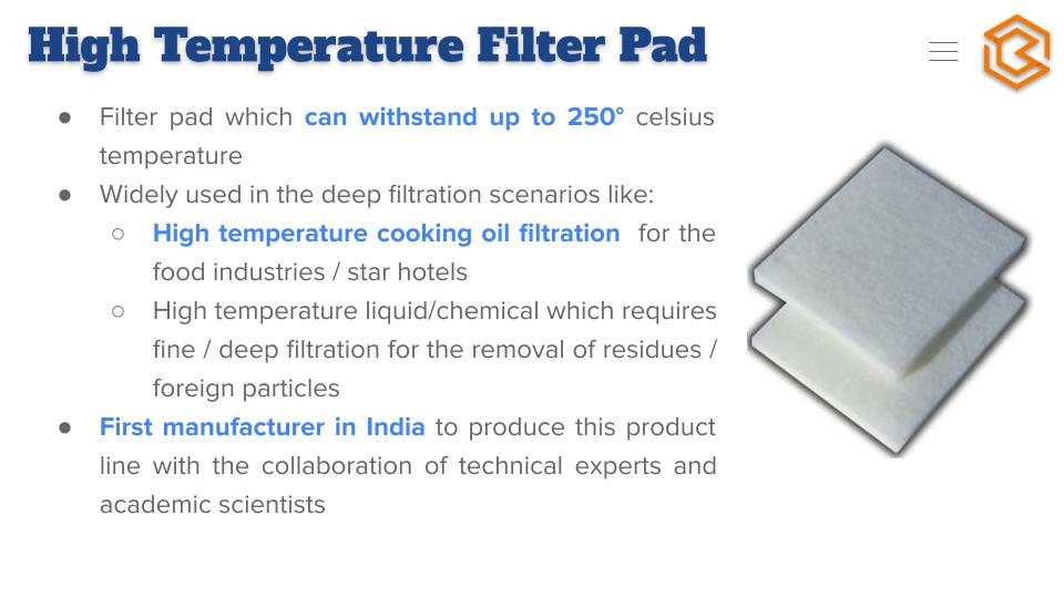 Heat resistant high temperature filter pads are technically advanced filtration medium used to filter edible cooking oils or other liquids/chemicals where the operating temperature is within range of 180° C. to 250° C.